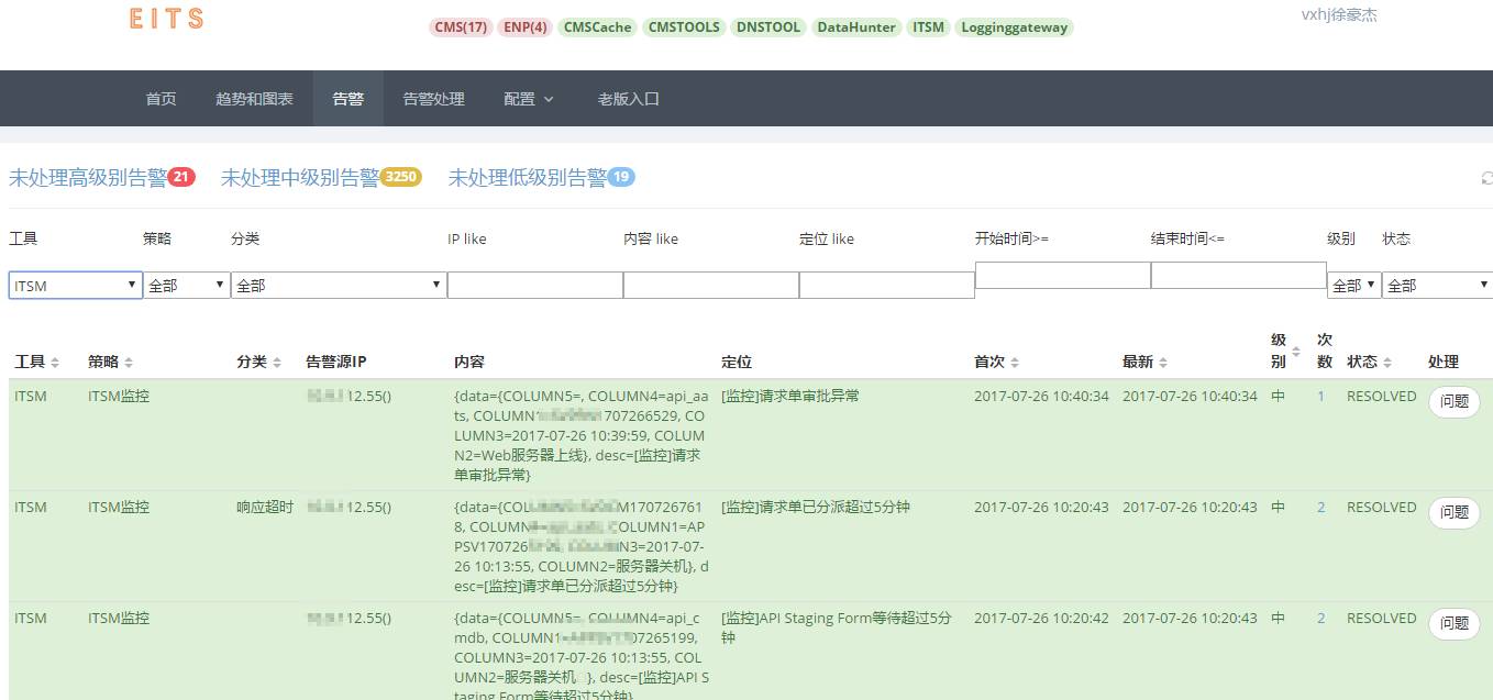 流程执行过程的异常由监控告警平台EITS负责处理,通过这个平台我们可以配置告警策略以及不同报警的分类,一旦流程执行异常时,告警会通过邮件方式提醒用户处理,用户可以登录到平台查找到对应的告警进行问题处理。