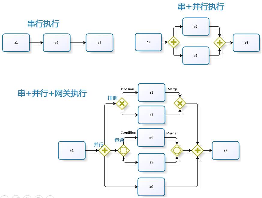 前面我们提到了,原来的流程引擎只能处理串行、并行以及简单的分支合并,在新一代流程平台我们做了一些设计调整,可以覆盖所有流程场景,我们以下图中最后面的一张图为例进行详细说明: