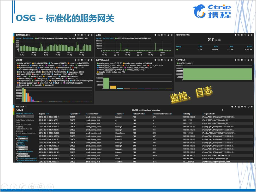 对于工具之间服务相互访问日志都会被集中采集并吐到后台ES服务器,用户可以通过前端可视化的界面对服务的质量、工具的访问进行实时监控、同时可以根据日志进行问题排查。
