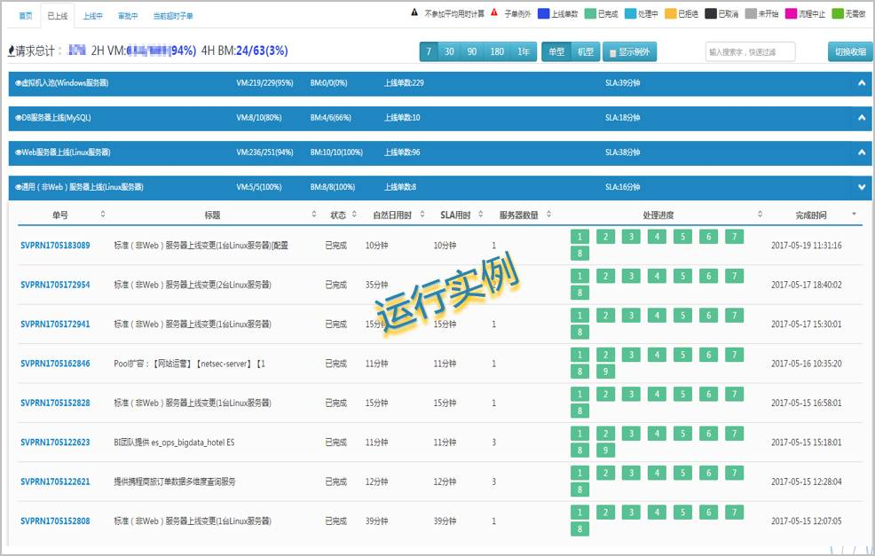 下图就是流程平台可视化界面,可以看到目前所有运行中的流程实例,它们的运行状况,流程的运行时间,不同流程的运行数,当某个流程实例运行超过预定SLA时长,也可以查找超时子单,并找到相应的责任团队。