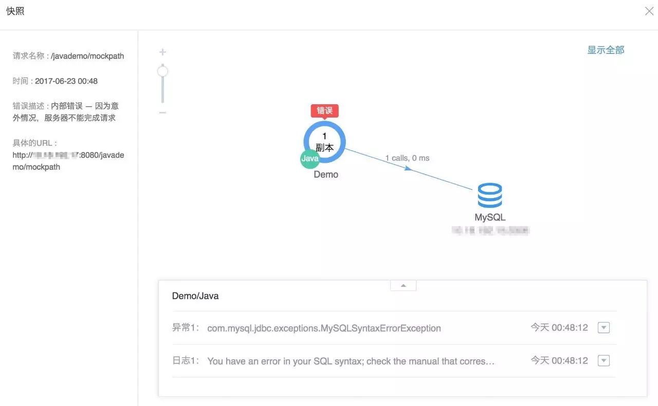 请求快照通过全链路跟踪技术把单个请求经过各个服务的调用数据关联起来,如性能数据(服务间调用性能,访问中间件的性能等),异常堆栈信息,错误日志信息等,在需要定位问题时,可以根据整个调用链中的信息快速定位问题。