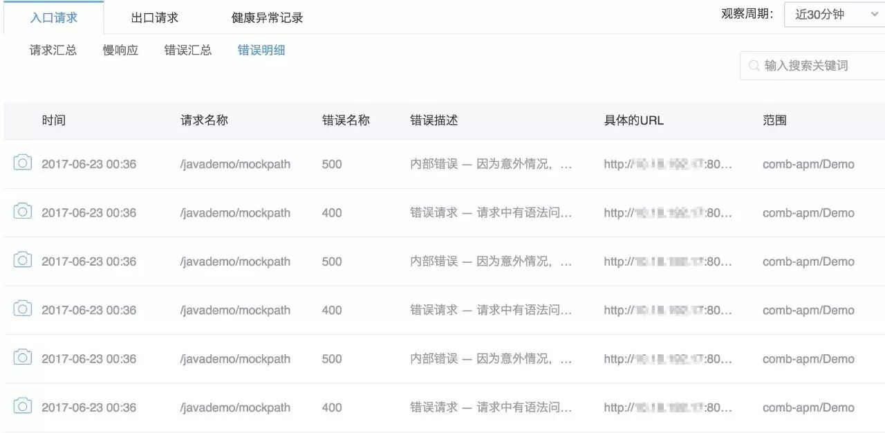 针对错误请求,我们也会给出错误详情,如具体发生的时间,发生问题的请求地址及所属的服务等: