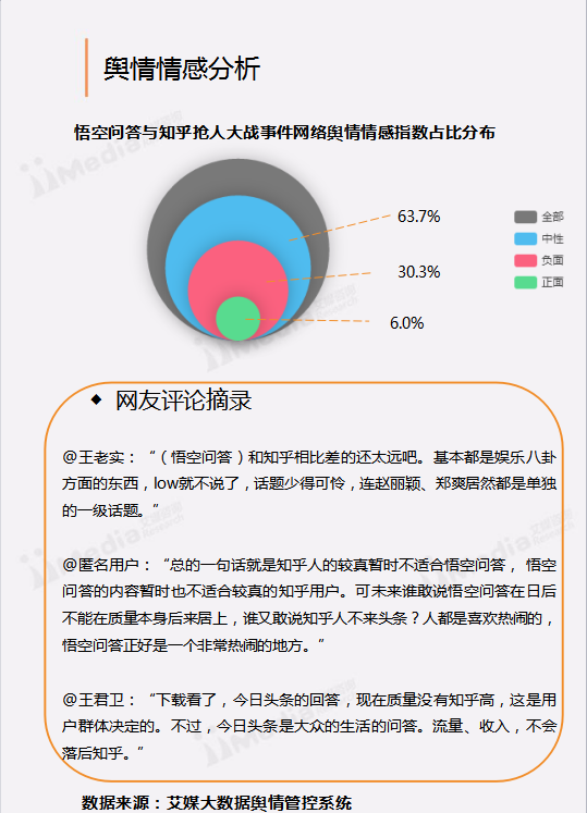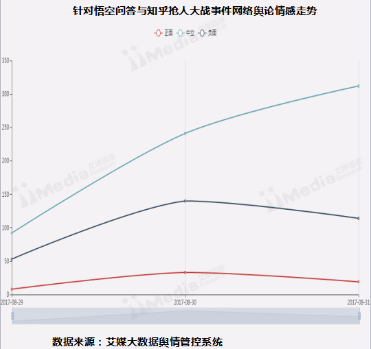 艾媒大数据舆情管控系统结果显示,自2017年8月29日开始,中立舆情持续高升,超越负面和正面舆情,在31日达到中立舆情走势高峰。在整个网络舆情中,悟空问答与知乎“抢人”事件整体呈中立。