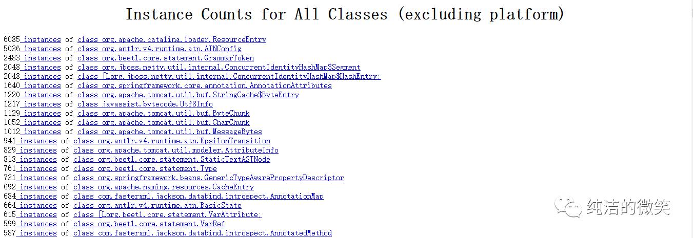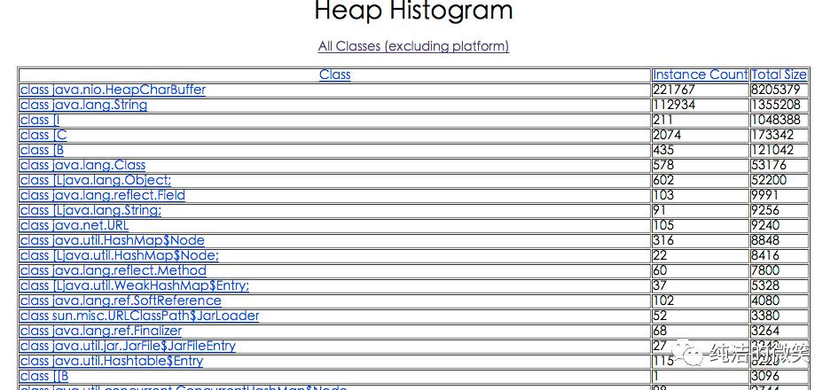 一般查看堆异常情况主要看这个两个部分: Show instance counts for all classes (excluding platform),平台外的所有对象信息。如下图: