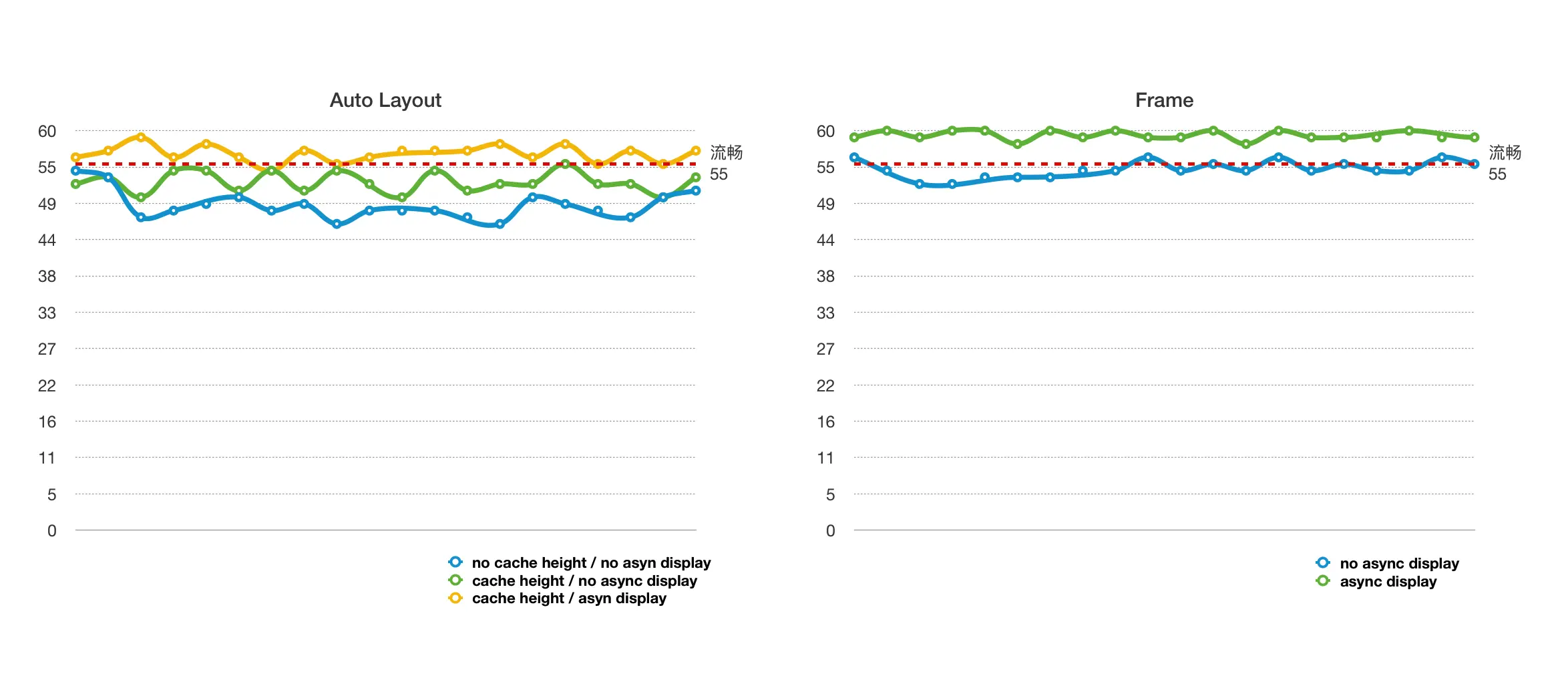 大家可以看看上面这张图的对比分析,数据是 iPhone6 的机子用 instruments 抓的,左边的是用 Auto Layout 绘制界面的数据分析,正常如果想平滑滚动的话,fps 至少需要稳定在 55 左右,我们可以发现,在没有缓存行高和异步渲染的情况下 fps 是最低的,可以说是比较卡顿了,至少是能肉眼感觉出来,能满足平滑滚动要求的也只有在缓存行高且异步渲染的情况下;右边的是没用 Auto Layout 直接用 frame 来绘制界面的数据分析,可以发现即使没有异步渲染,也能勉强满足平滑滚动的要求,如果开启异步渲染的话,可以说是相当的丝滑了。