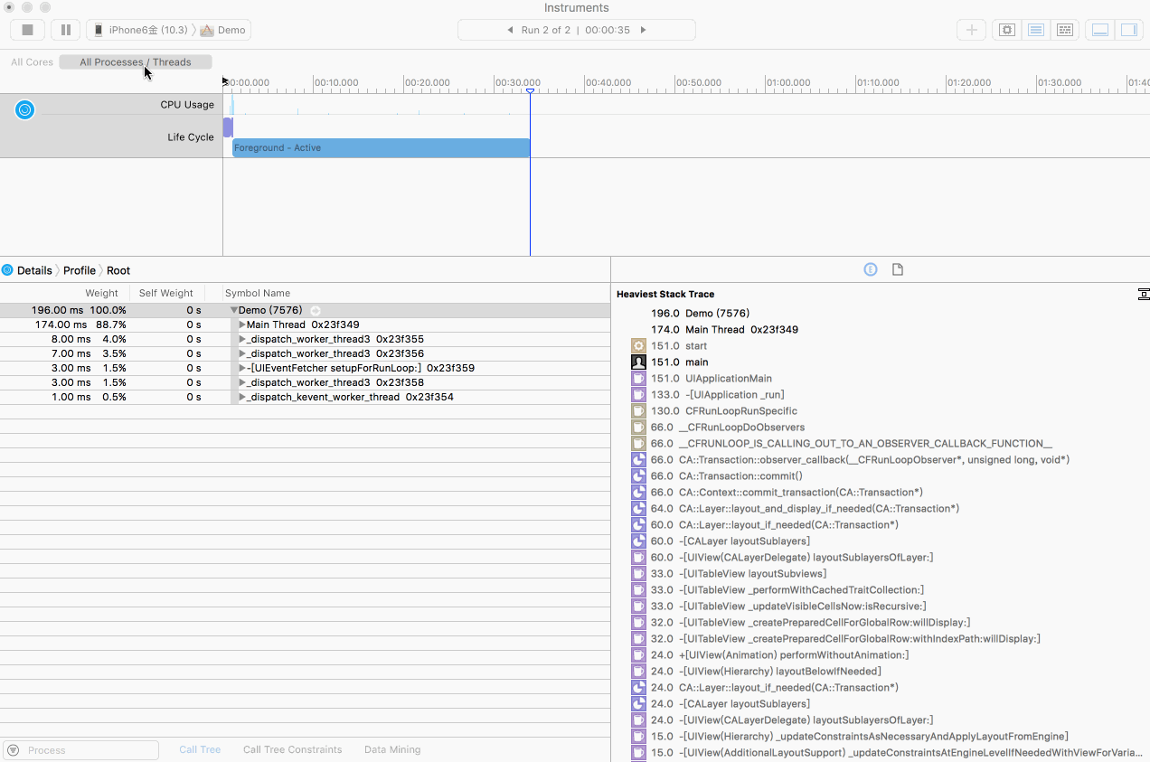 我们选中主线程,去掉系统的方法,然后操作一下列表,再截取一段调用信息,可以发现我们自己实现的方法并没有消耗多少时间,反而是系统的方法很费时,这也是卡顿的原因: