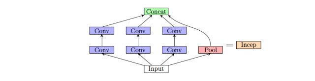 GoogleNet [18] 引入新型层(现有层的联结):inception 层(名字来自诺兰的电影《盗梦空间》)。GoogleNet 不通过简单的池化、卷积或全连接操作从 CNN 的一个层到达下一个层,而是平均下列架构的结果。