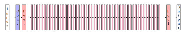 ,恢复最初的特征图大小。ResNet 架构接着堆栈大量残差模块(通常是 50 个),从卷积池层开始,以池化操作结束,从而获得一个输出函数可以直接应用的全连接层。下面是一张图示。