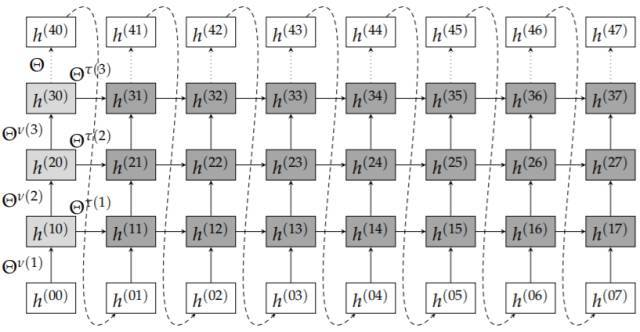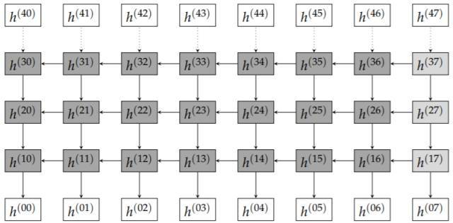 图 6.1 RNN 架构,数据在「空间」和「时间」域同时传播。在我们的例子中,时间尺寸为 8,而空间尺寸为 4。