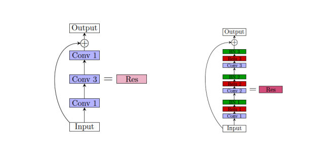 图 5.16:Bottleneck 残差架构。左图比较简略,右图较为具体。共有步幅 1、padding 为 0 的 1 x 1 卷积,一个标准的 VGG 卷积和 1 x 1 卷积。图示对 ResNet 做出的两个重要更新是:BN 操作放在 ReLU 之后,最后的 ReLU 在额外操作之前。