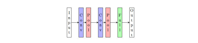 图 5.1:一个典型的 CNN 架构(受到 LeNet 启发):卷积操作之后跟着池化操作,直到每一个特征图的大小降为 1。然后再引入全连接层。
