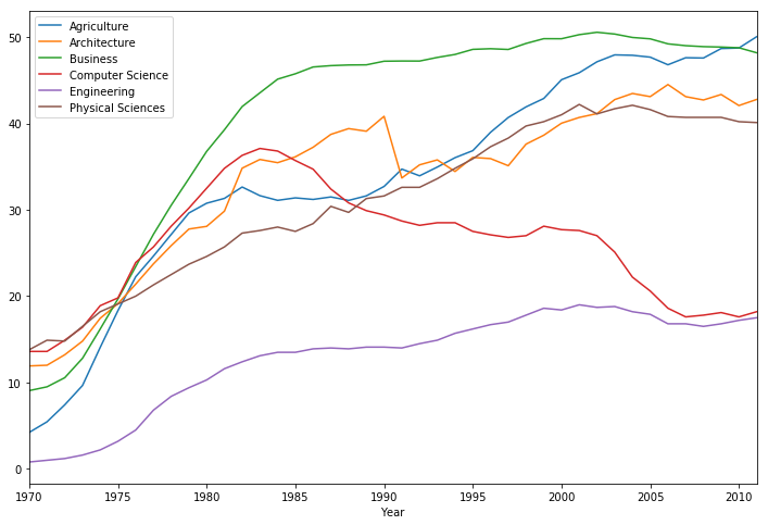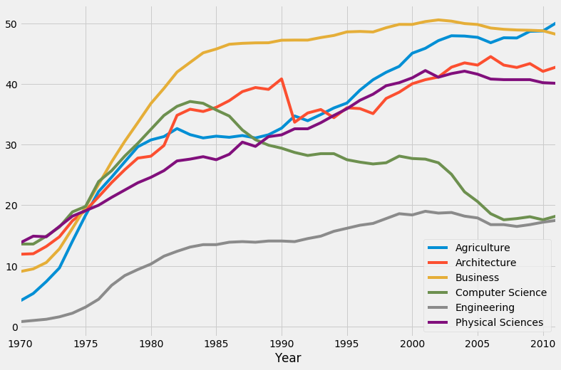 fte_graph = women_majors.plot(x = 'Year', y = under_20.index, figsize = (12,8))