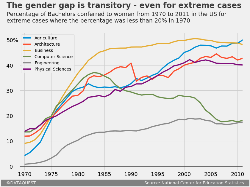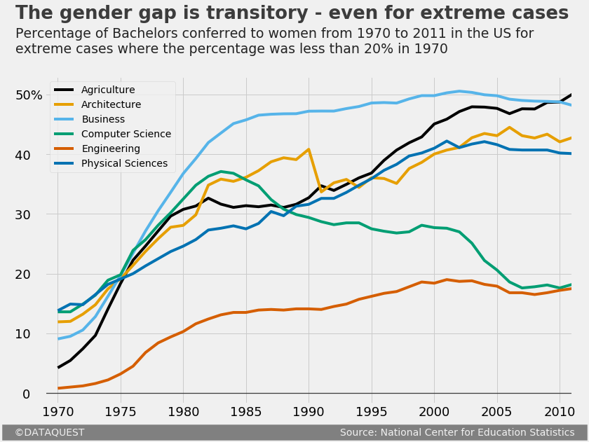 s = 'Percentage of Bachelors conferred to women from 1970 to 2011 in the US fornextreme cases where the percentage was less than 20% in 1970',