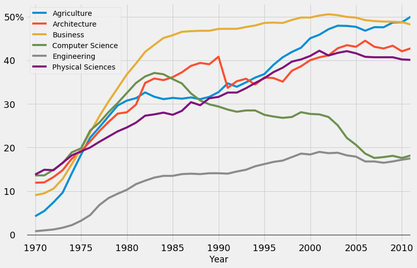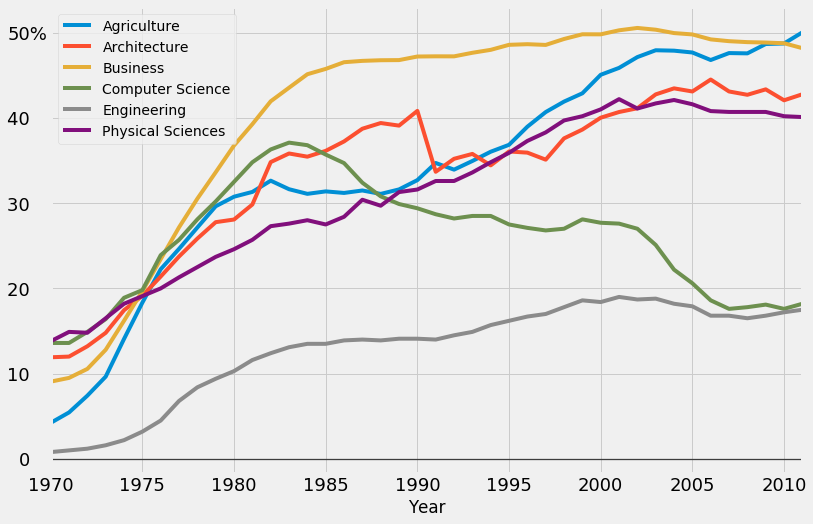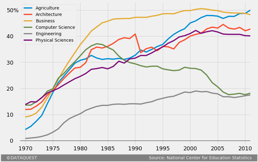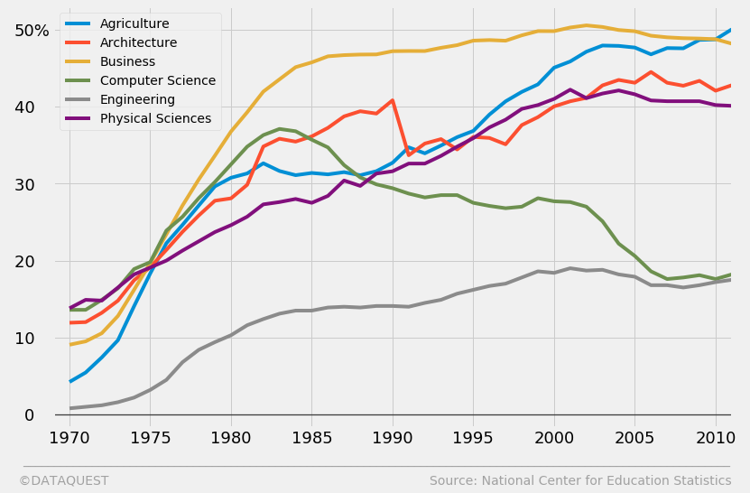 fte_graph.text(x = 1976, y = 25, s = 'Physical Sciences', color = colors[5], weight = 'bold', rotation = 27,