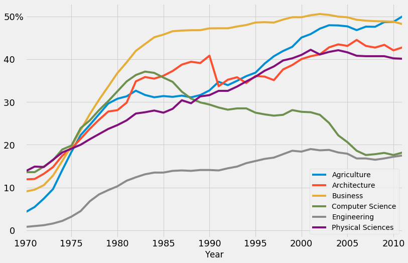 fte_graph.text(x = 1987, y = 11.5, s = 'Engineering', color = colors[4], weight = 'bold',
