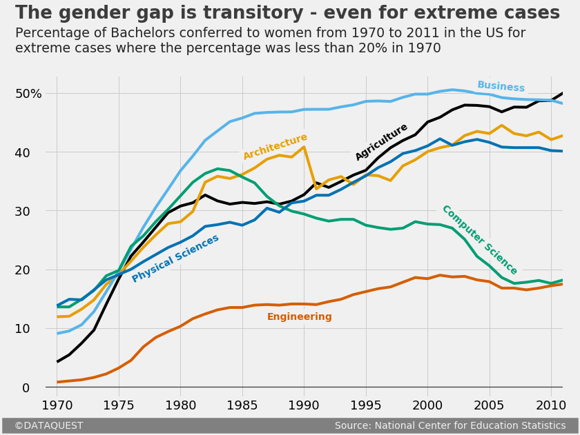 fte_graph.text(x = 1966.65, y = 62.7, s = "The gender gap is transitory - even for extreme cases",