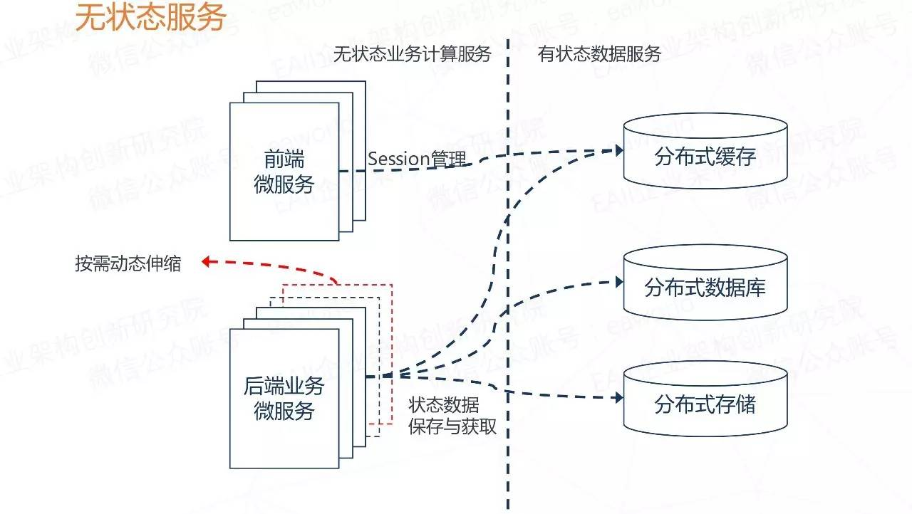 那么这个无状态服务原则并不是说在微服务架构里就不允许存在状态,表达的真实意思是要把有状态的业务服务改变为无状态的计算类服务,那么状态数据也就相应的迁移到对应的“有状态数据服务”中。