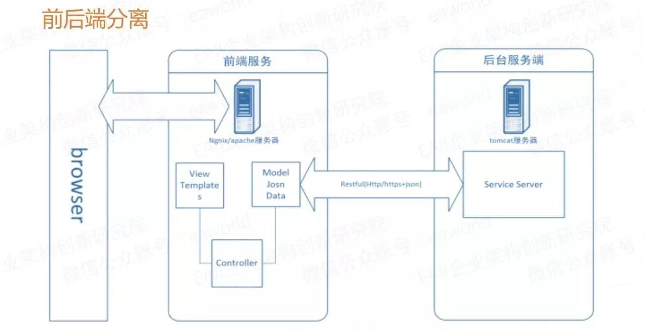 前后端分离原则,简单来讲就是前端和后端的代码分离也就是技术上做分离,我们推荐的模式是最好直接采用物理分离的方式部署,进一步促使进行更彻底的分离。不要继续以前的服务端模板技术,比如JSP ,把Java JS HTML CSS 都堆到一个页面里,稍复杂的页面就无法维护。这种分离模式的方式有几个好处: