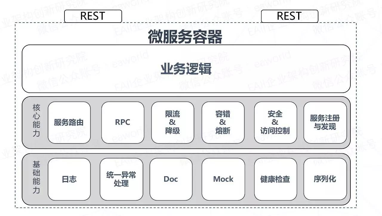 我们再来看一下微服务运行容器的一个逻辑图,大家可以看到,我们要做微服务架构的应用,可靠高效的微服务应用,实际上我们需要做的事情还是非常多的。如果没有一个统一的微服务容器,这些能力在每个微服务组件中都需要建设一遍,而且会五花八门,也很难集成到一起。有了统一的微服务运行容器和一些公共的基础服务,前面所提到的微服务架构下部分组件重复建设的问题也迎刃而解。