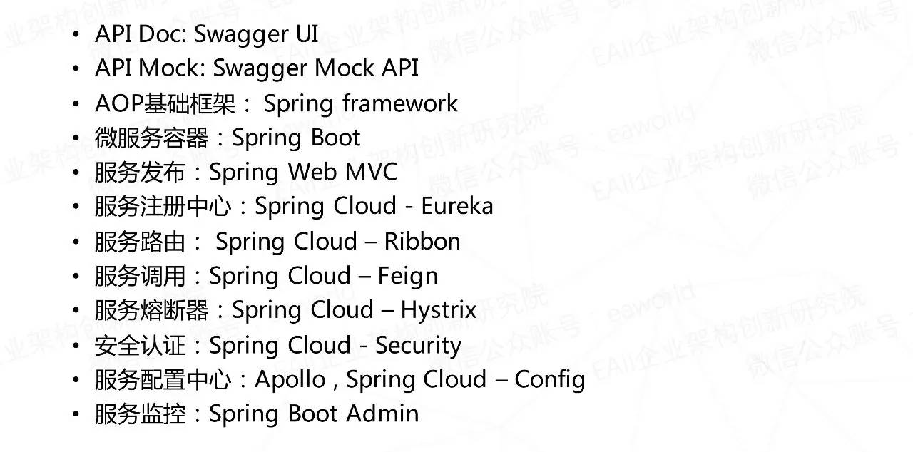 我们的API管理契约文档API模拟我们是集成了Swagger的工具链。微服务应用平台的基础就是SpringCloud,从容器框架到注册发现再到安全认证这些基础方案均采用了他的能力来支撑。下面简单看下我们集成的一些开源框架和工具。