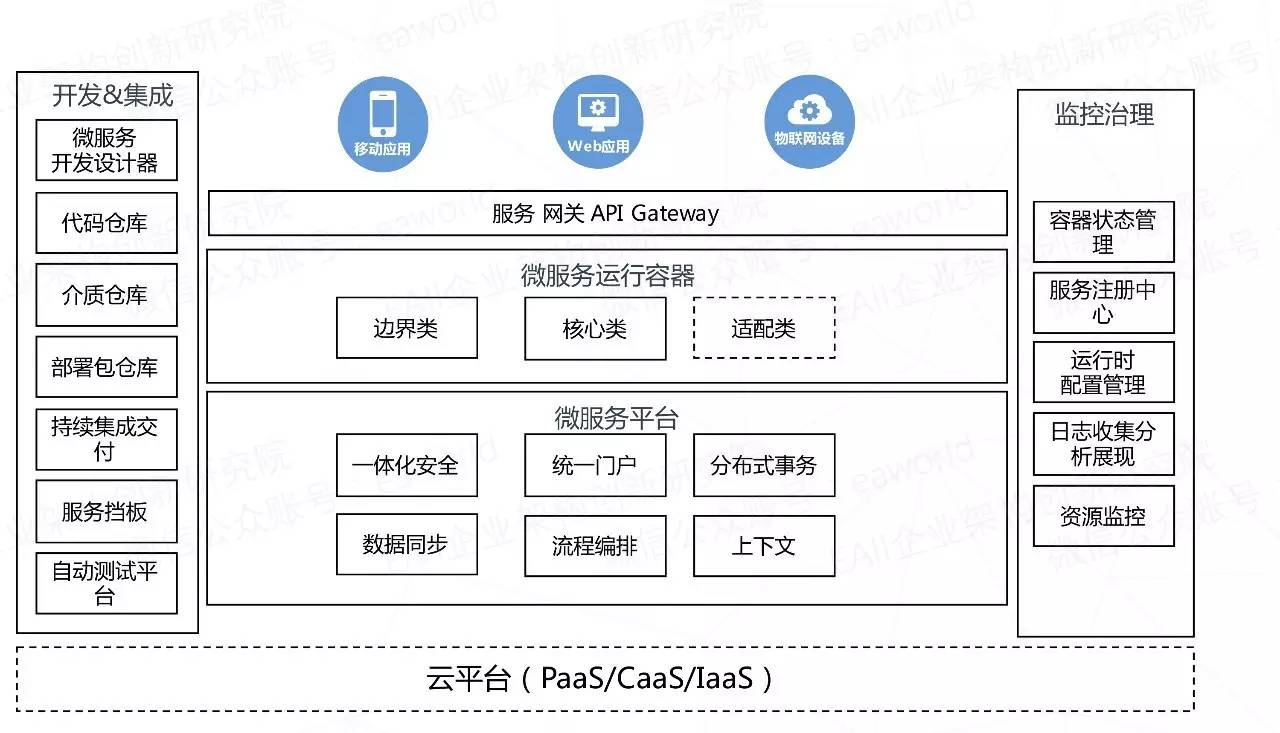 微服务应用平台的总体架构,主要是从开发集成、微服务运行容器与平台、运行时监控治理和外部渠道接入等维度来划分的。