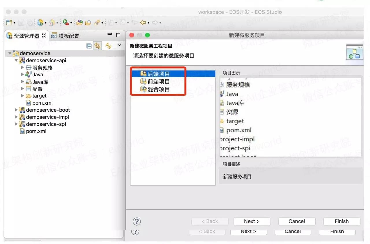 前面的设计原则中提到了一个前后端分离的原则,那么我们的开发环境中,目前支持创建前端项目、后端项目和混合项目。其中前端项目、后端项目就对应前后端分离的原则,利用平台中集成的开发工具和框架可以做到前后端开发分离,利用持续集成工具可以方便的将前端、后端项目编译打包成可独立运行的程序。混合项目则是为了兼容传统模式而保留的,为企业应用向微服务架构演进提供过渡方案。