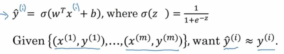 回忆一下,这是上一张幻灯片的函数,所以你的输出y_hat=sigmoid(w^Tx+b),这里定义为sigmoid(z)。为了让模型通过学习来调整参数,要给一个m个样本的训练集,很自然地,你想通过在训练集找到参数w和b,来得到你的输出。