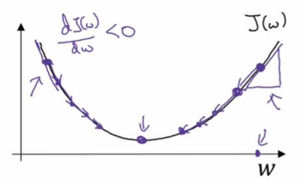 另一个例子,如果w的位置是在这里,这个点处的斜率将会是负的。用梯度下降法去更新,w将会减去α乘上一个负数,慢慢使得参数w增加。不断地用梯度下降法来迭代,w会变得越来越大。无论你初始化的位置,是在左边还是右边,梯度下降法会朝着全局最小值方向移动。
