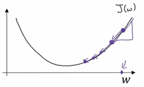 现在我们确保梯度下降法更新是有用的,w在这,对应的成本函数J(w)在曲线上的这一点。记住导数的定义,是函数在这个点的斜率,而函数的斜率是高除以宽,在这个点相切于J(w)的一个小三角形。在这里导数是正,新的w值等于w自身减去学习率乘导数。导数是正的,从w中减去这个乘积,就向左边走一步。对于一开始就很大的参数w来说,像这样,梯度下降法让你的算法,渐渐地减小这个参数w。