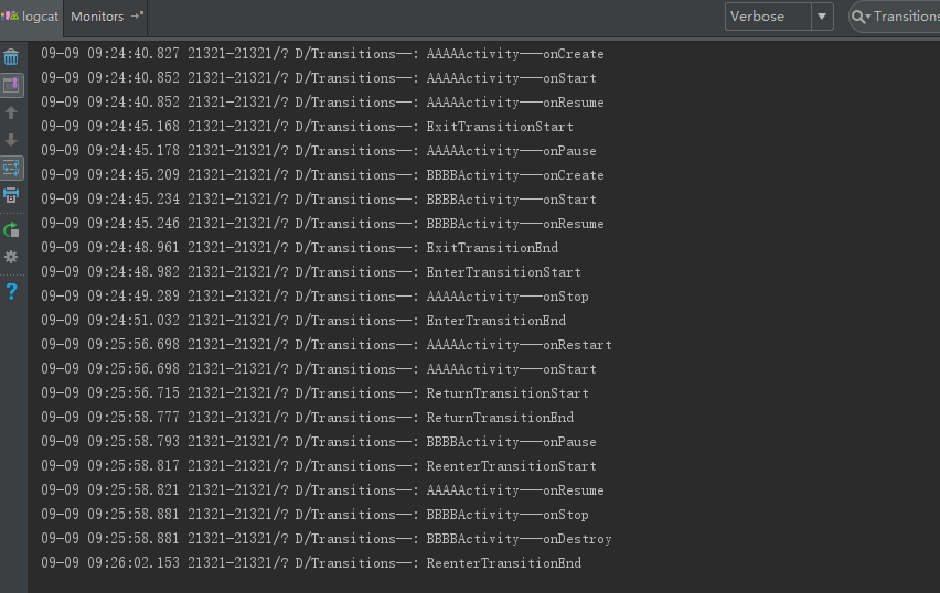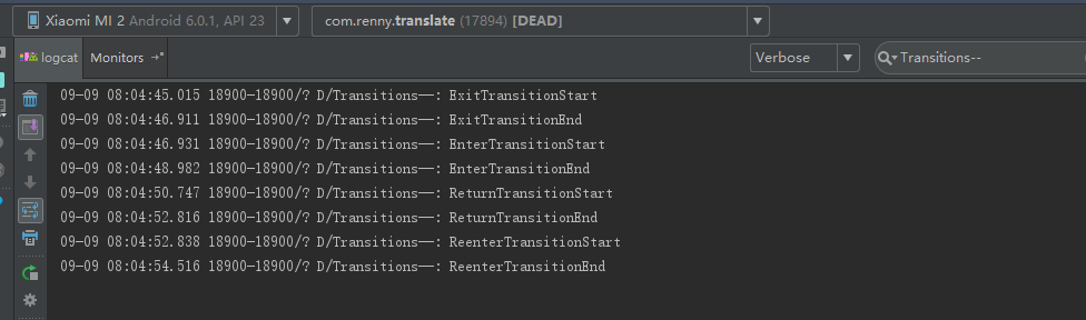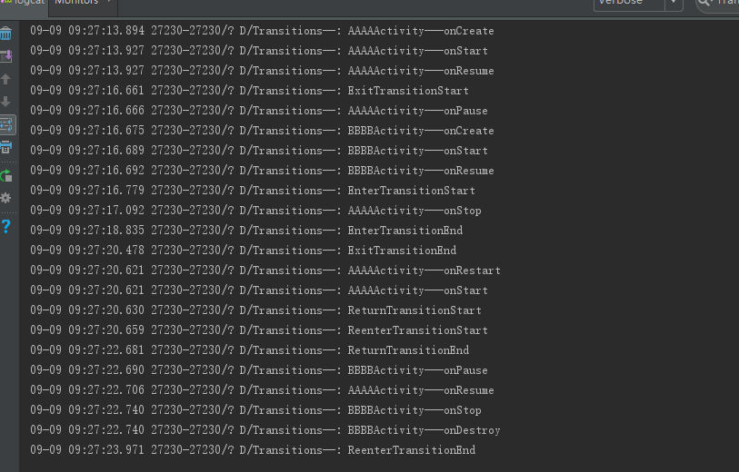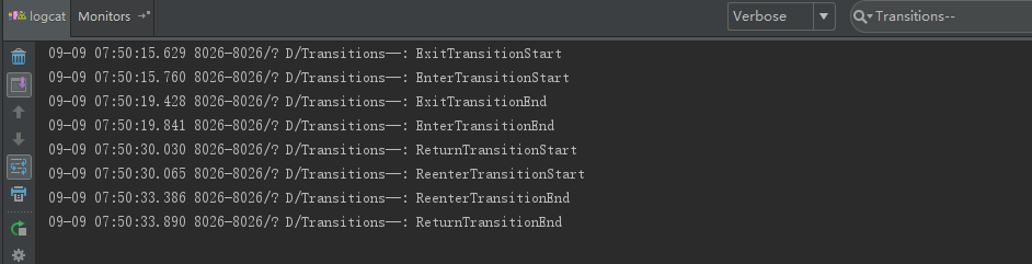以上这个过程同样可以看做是Transition作用在Scene上的一系列效果,只不过这里的Scene从上一篇中的单一布局换成了Window。不过细心的同学可能发现了,明明我为四个过程都设置动画效果,可为什么ExitTransition没有生效呢?接下来我们为每个Transition加入监听,看看动画的执行流程。下面是其中一个的代码,其他三个都一样: