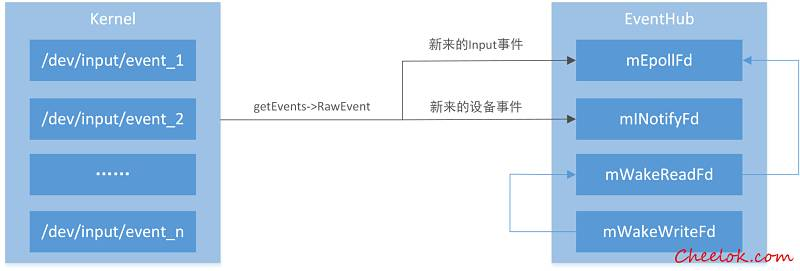 那么这里抛出一个问题:为什么要把管道的读端注册到epoll中?假如EventHub因为getEvents读不到事件而阻塞在epoll_wait()里,而我们没有绑定读端的话,我们要怎么唤醒EventHub?如果绑定了管道的读端,我们就可以通过向管道的写端写数据从而让EventHub因为得到管道写端的数据而被唤醒。