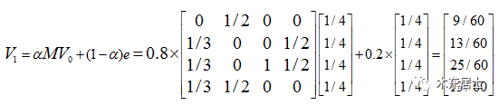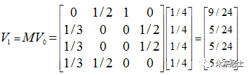 在算法的第一轮计算中,我们假设上网者在每一个网页的概率都是相等的,即1/n,于是初试的概率分布就是一个所有值都为1/n的n维列向量V0,用V0去右乘转移矩阵M,就得到了第一步之后上网者的概率分布向量MV0,(nXn)(nX1)依然得到一个nX1的矩阵V1,*这个V1就是一轮迭代计算出来的PageRank值。下面是V1的计算过程: