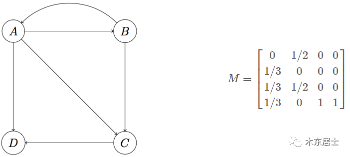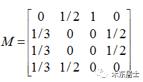 我们在做计算的时候会将该图表示成一个二维的矩阵,我们做一个转换,就会变成下图的矩阵形式。M(i,j)表示j节点指向i节点的概率