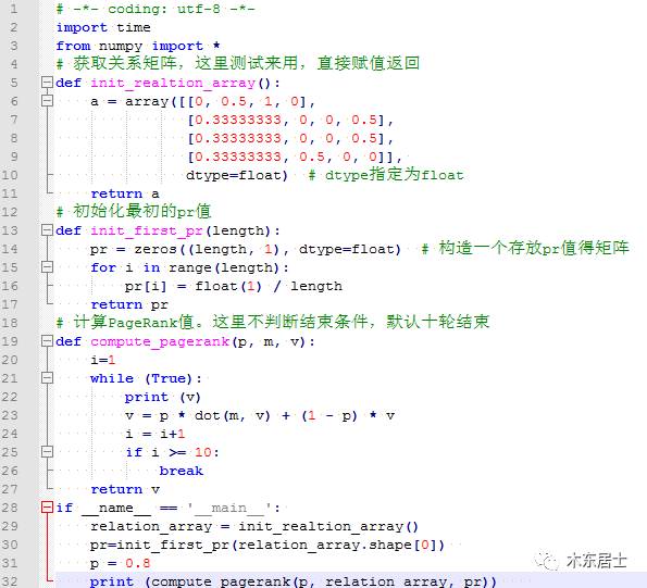 这是最初自己写着玩,用二三十行代码来熟悉算法的基本实现。 真正线上的程序还是要用MR来写的。后续专门来一篇MR写PageRank算法的实现,以及在工程上的深度优化。