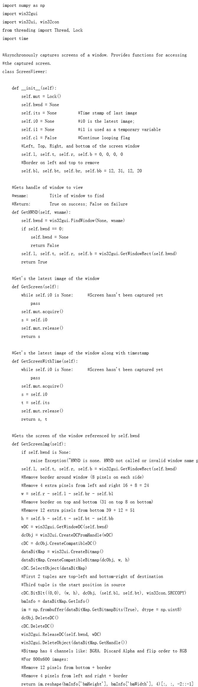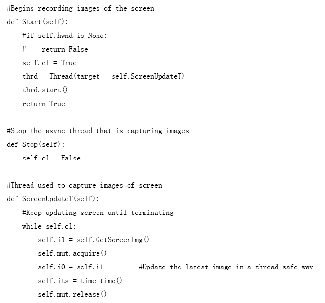 由于游戏需要不停地捕捉画面图像,所以我们会把捕捉程序单独写进一个线程,并以异步和线程安全的方式为其他线程提供一个读取图像的接口。这样一来画面图像就总是可以即时获取。这一操作可以通过线程库中的线程和锁定对象来实现。