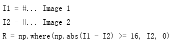 用于移动检测的图像数据是通过快速连续地捕获画面的2帧图像并且仅保留图像中显著不同的区域得到的。这是使用numpy.where函数实现的(16是任意选择的阈值)。