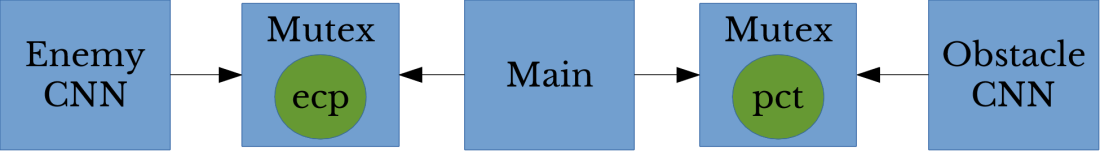 因此,并行执行分类,并且使用互斥锁以线程安全的方式将包含预测的数据成员提供给主线程。图6说明了线程和互斥锁的逻辑组织。在图中,ecp和pct分别是包含敌方单元格位置和预测单元格类型的Bot类的数据成员。