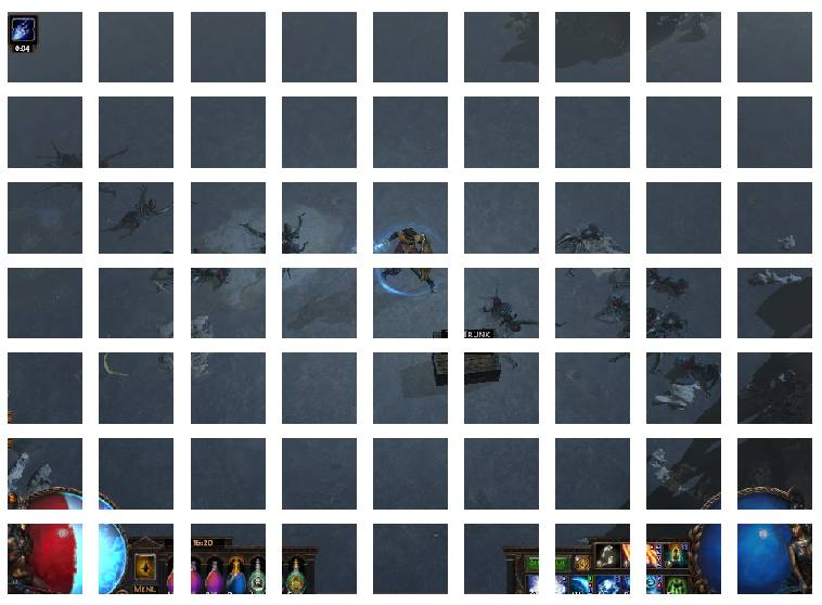为了简化目标检测任务,游戏画面被划分成相等大小的矩形区域。对于800×600分辨率的画面,我们选择由m = 7行和n = 9列组成的网格。从画面的底部,左侧和右侧边缘分别移除十二个,四个和四个像素,使得所得到的尺寸(792和588)能够分别被9和7整除。因此,屏幕网格中的每个矩形的宽度和高度分别为88和84像素。图2展示出了使用上述方案分割的游戏画面图像。