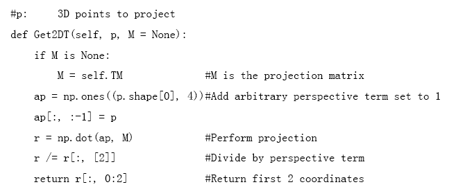 上面的投影看起来还蛮合理的。在投影矩阵标定好的情况下,可以使用下面的函数把一个三维点(每一行为1点)矩阵投影到平面上。