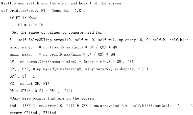 在上述两个函数中,投影矩阵的转置计算是影响效率的主要因素。有了以上两个函数之后,我们就可以用下面的代码计算在800*600屏幕上xy平面的网格点。下面这个函数将是后面跟踪玩家在一级平面上位置的关键。