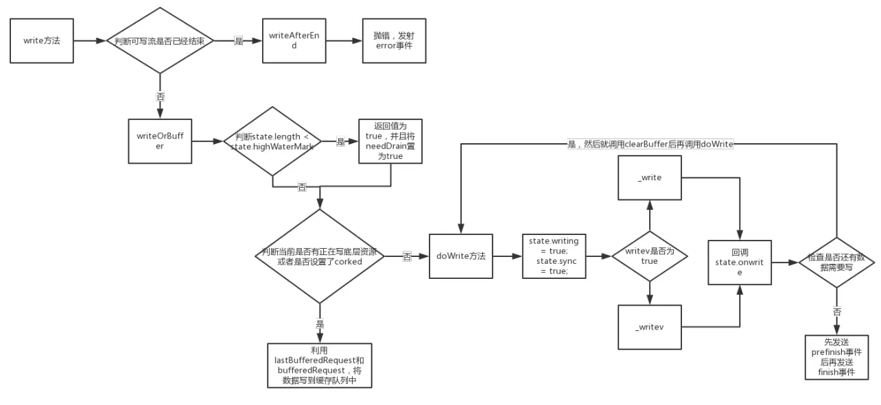 state.onwrite方法,进而不会更新状态,使writing一直是true - 因为第一次是直接调用doWrite方法写到底层资源上,并不会去走缓存的那个判断
