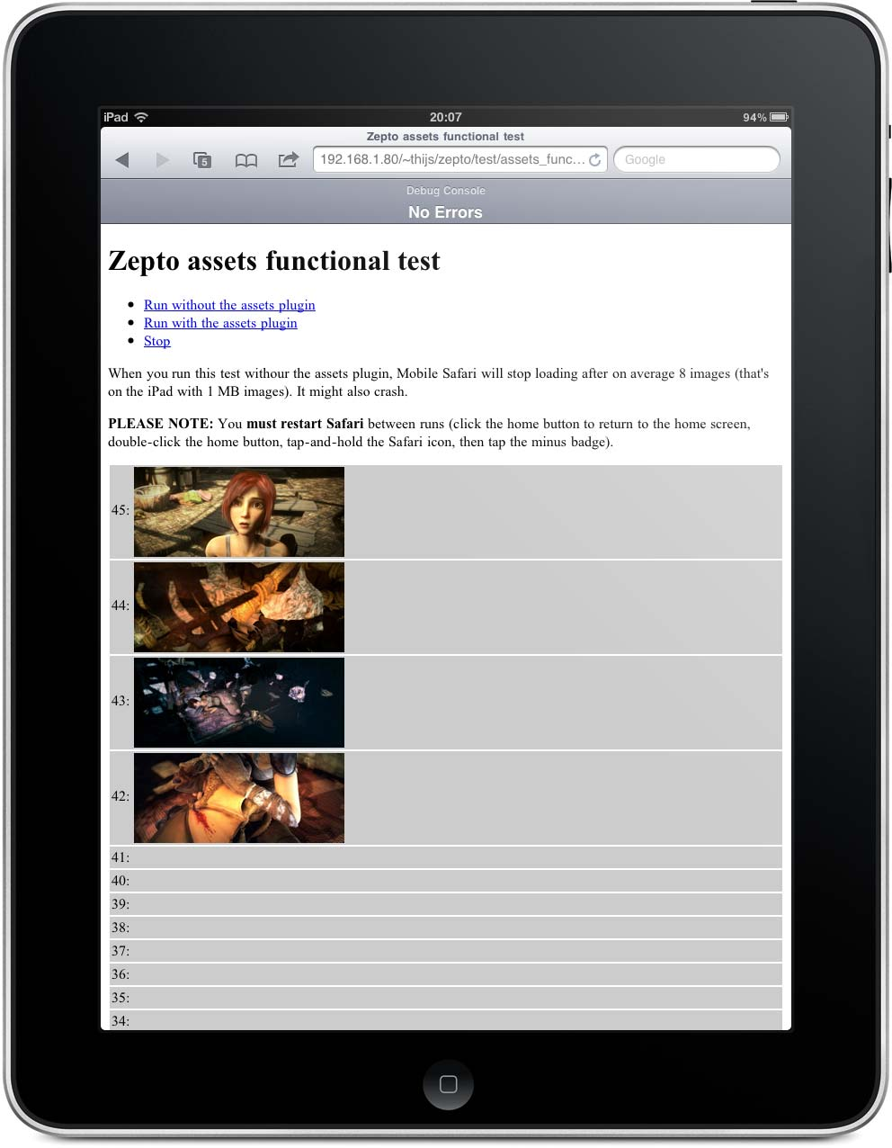 (如果你只是删除图片元素, iPad 在加载8张图片后会停止继续加载,如果用 Zepto 的 assets 插件,会持续加载。)