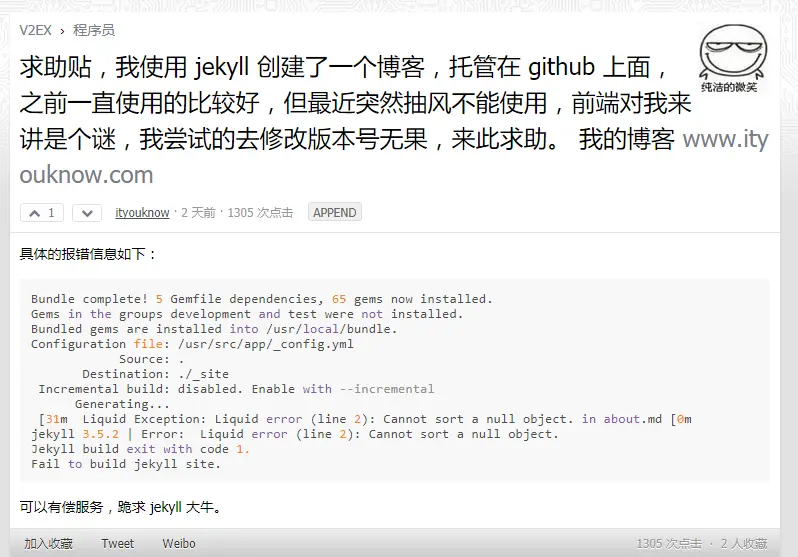 求助主题作者和自力更生都无果之后,就想着找一些对jekyll和前端比较熟悉的大牛,帮我看看如何去解决。在QQ群中发了一些求助信息后,也没有找到合适的对象,于是就想到了v2ex,以前总听说v2ex是一个神奇的社区,但我完全不明白神奇在哪里,以前也使用过一两次,也么看出个所以然。当然我还是抱着死马当作活马医的态度在v2ex发了一个帖子: