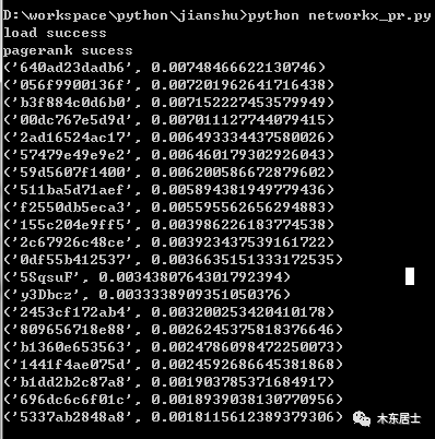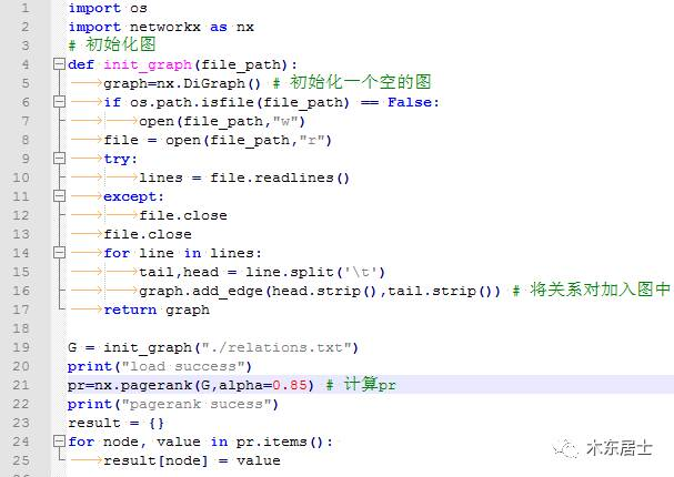 使用NetworkX包的话就很简单了,本来想用Matplotlib画一下关系图呢,但是数据量太大,后续到数据可是化的时候用Gephi或者Tableau玩一下。 下面是一个简单的代码,求取PageRank值。