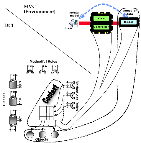 DCI 之所以被提出,是因为传统 mvc 代码,在越来越丰富的交互需求中变得越来越难读。有人会觉得,复杂的需求 mvc 也可以 cover 住,诚然如此,但很少有人能只读一遍源码就能理解程序处理了哪些事情,这是因为人类思维与 mvc 的传统程序设计思想存在鸿沟,我们需要脑补内容很多,才会觉得难度。