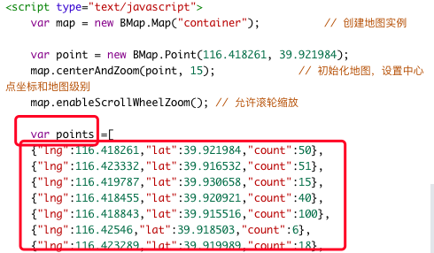 这种[{x:x,x:x},{x:x,x:x}]格式的数据,是一种json格式的数据,由于具有自我描述性,所以比较通俗易懂,大概可以知道这里的三个值,前俩个是经纬度,最后一个应该是权重(我猜的)。