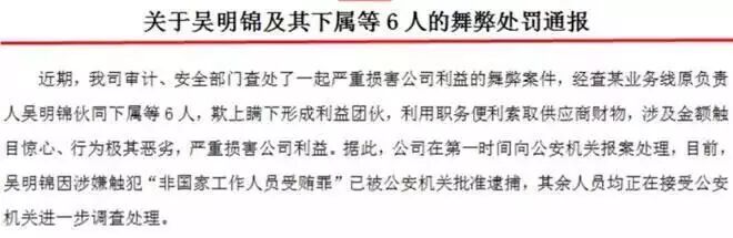 《关于吴明锦及其下属等6人的舞弊处罚通报》显示,吴明锦伙同下属等6人,欺上瞒下形成利益团伙,利用职务便利索取供应商财物,严重损害公司利益。小米公司已向公安机关报案处理。目前,吴明锦因涉嫌触犯“非国家工作人员受贿罪”己被公安机关批准逮捕,其余人员均正在接受公安机关进一步调查处理。