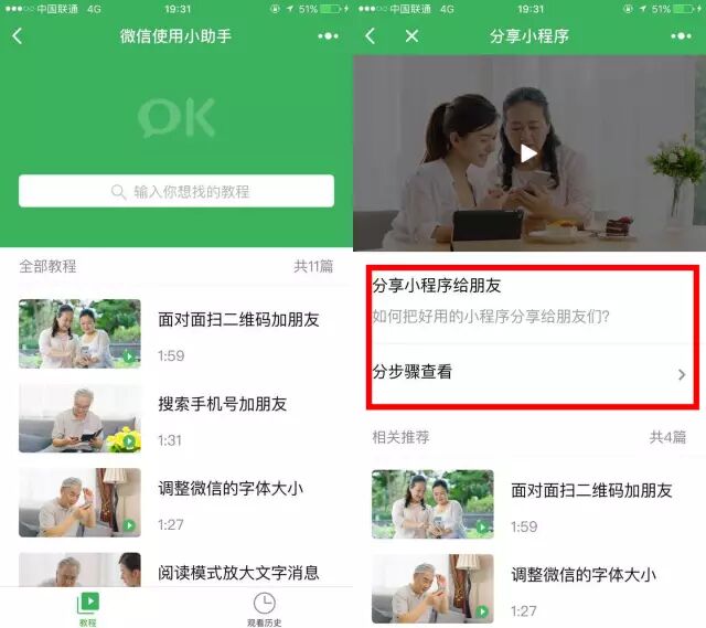 这还没完,前几天,微信官方团队又推出一个适合中老年人使用的小程序 “微信使用小助手”,通过官方制作的一系列视频及图文教程,教会中老年用户如何在微信上加好友、发表情包、打字、发语音、发照片、视频和语音通话等,帮助中老年用户更好地使用微信。