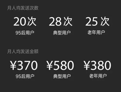 发红包:在月人均发送次数方面,老年用户25次平均380元,而95后用户为20次,80-90后的典型用户28次,月人均发送金额分别为370元和580元。