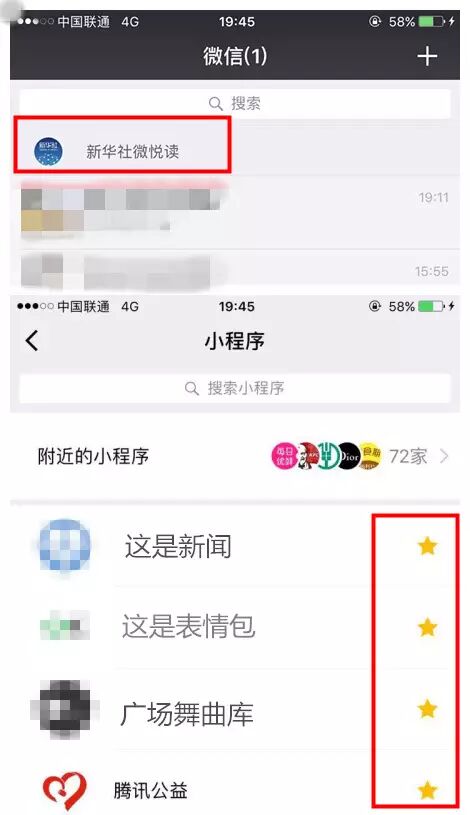 因为老年人面临记忆力衰退等问题,这时,小程序置顶和标星功能便派上用场,商家们需要做的便是如何在中老年用户的微信里,抢占这10个标星名额和1个置顶名额。比如从小程序名字上着手“这是表情包”、“这是新闻”、“广场舞曲库”等等。